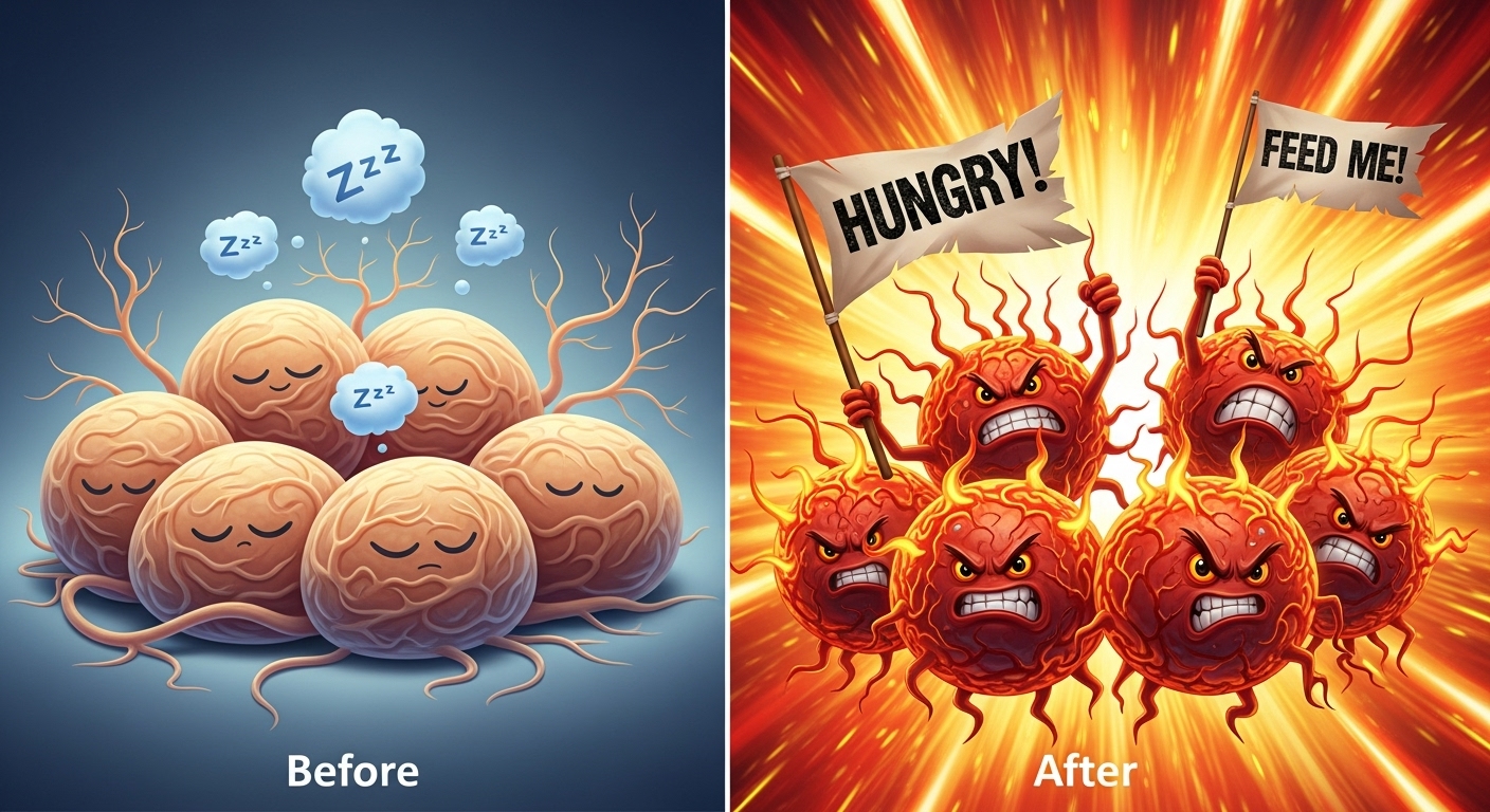 [5개월 전엔 얌전하던 뇌세포들이, 5개월 후 다시 깨어나 '배고파!' 깃발을 흔드는 귀여운 일러스트]