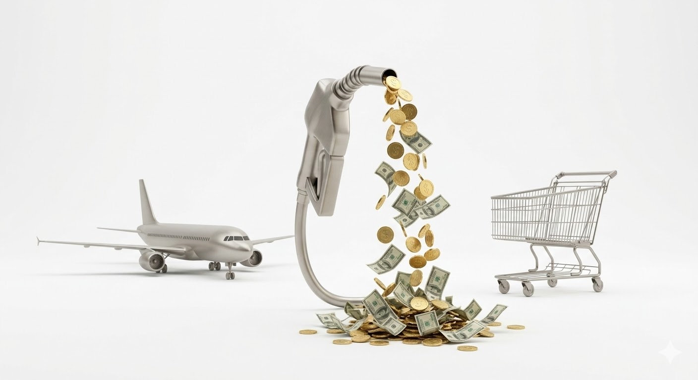 [주유기에서 달러가 새고 비행기와 카트가 멈춰 선 인포그래픽]