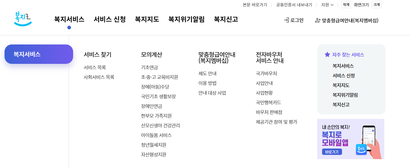 - 포털 사이트에 '복지로' 검색 후 홈페이지 접속